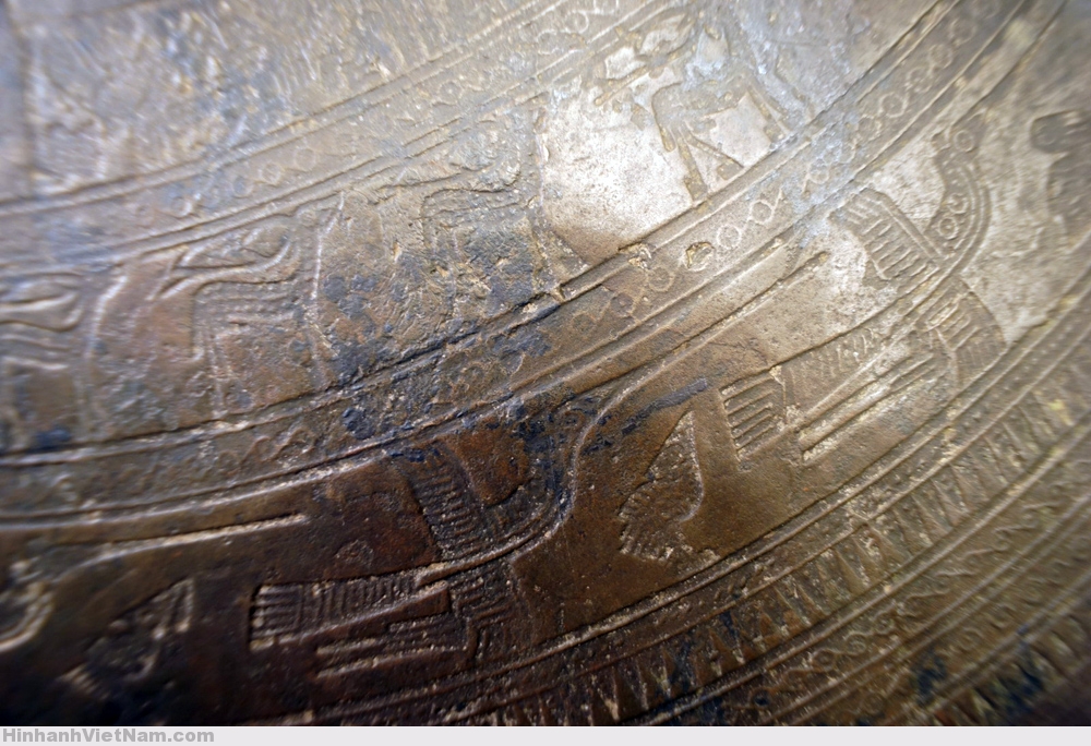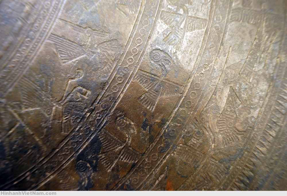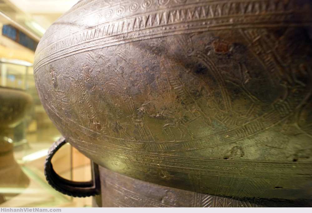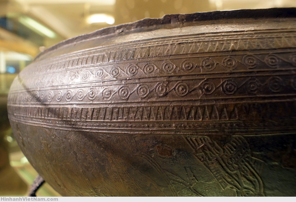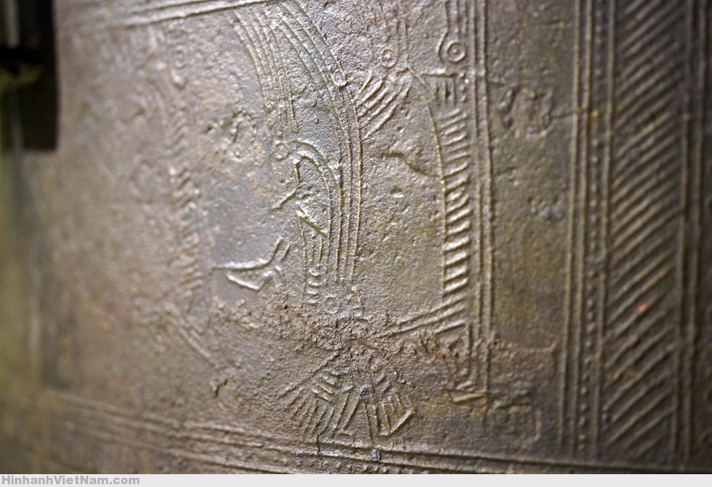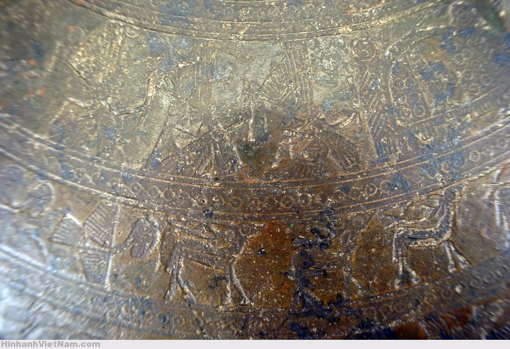 Phần dưới tang trống là 6 chiếc thuyền chuyển động từ trái sang phải, chở chiến binh tay cầm vũ khí và tù binh, xen giữa là những hình chim cò ngậm cá, chó săn được thể hiện theo lối cách điệu.