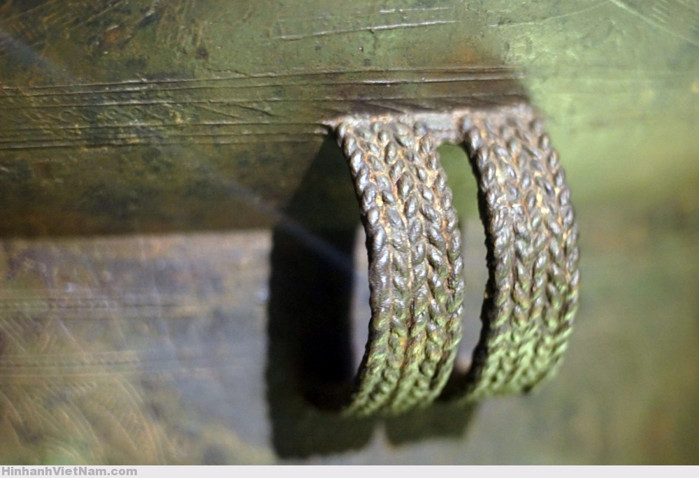 Có bốn chiếc quai chia làm hai cặp gắn vào tang và phần thân trống, được trang trí hình bện thừng / bông lúa.