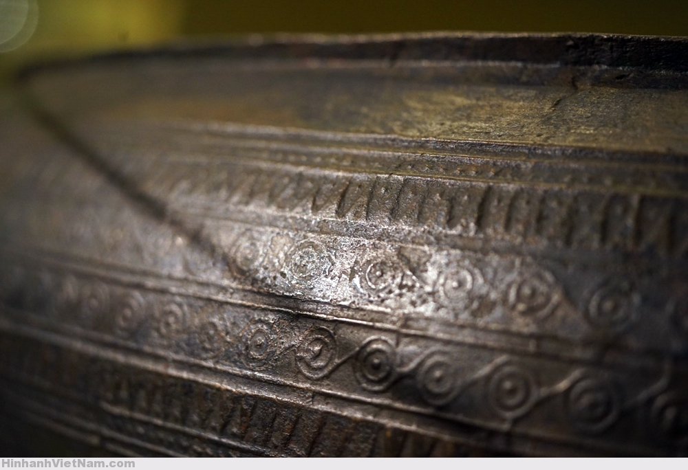 Phần dưới của thân là ba vành hoa văn hình học, giữa là vành văn vòng tròn chấm giữa có tiếp tuyến. Hai bên là hai đường chấm nhỏ. Ngoài cùng là hai đường chỉ trơn. Chân trống không có trang trí.