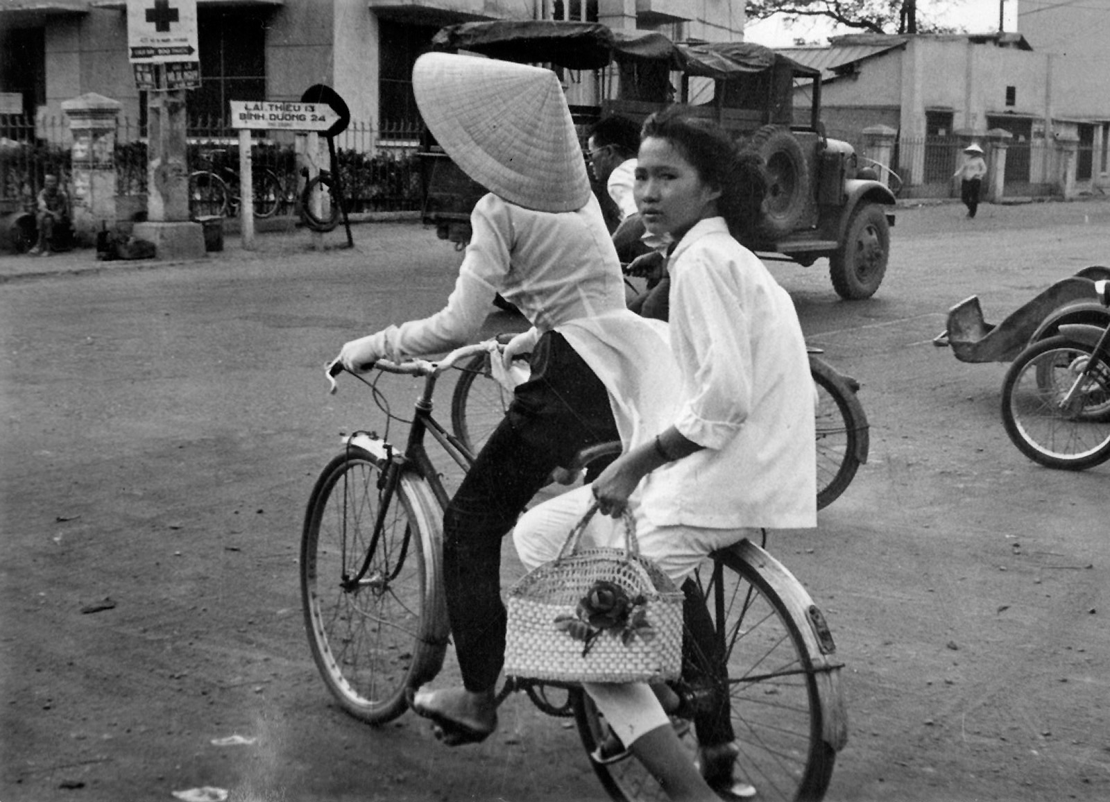 Ngã tư Phú Nhuận, bên trái là Bệnh viện Cơ Đốc – Bảng chỉ dẫn cạnh cột điện nơi góc ngã tư cho biết khoảng cách đường bộ đi Lái Thiêu là 13 km và đi Bình Dương (thị xã Phú Cường) là 24 km.