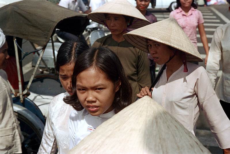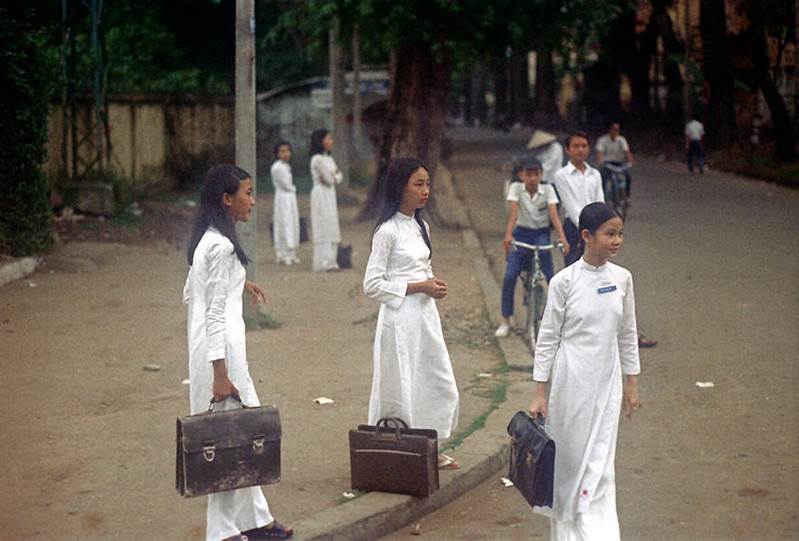 Cô nữ sinh trung học với áo dài trắng bên đường Phạm Ngũ Lão, phía xa là tòa nhà trên đường Hàm Nghi