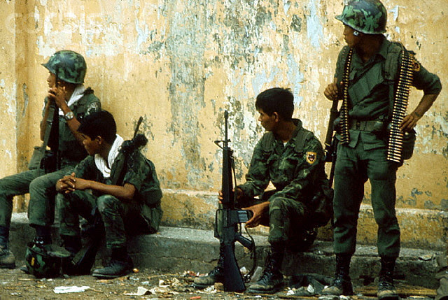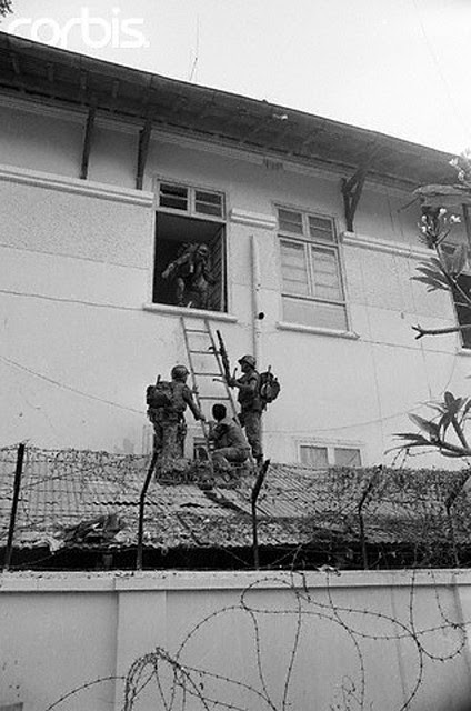 Những người lính VNCH đang dùng thang leo lên 1 building đọ súng với quân VC cố thủ bên trong.
