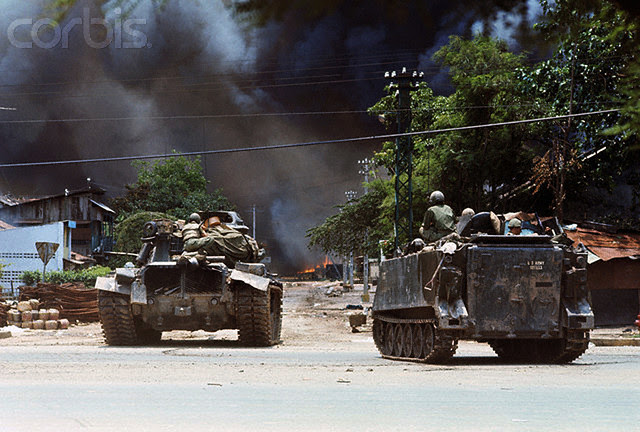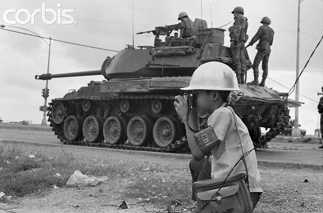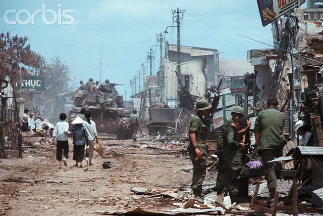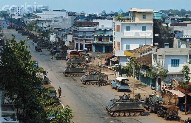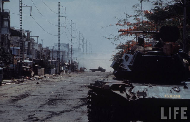 Khu vực này gần cầu chữ y : xe tăng Mỹ tham gia cùng quân lực VNCH truy quét tàn quân CS rút chạy và cố thủ trong các tòa nhà .