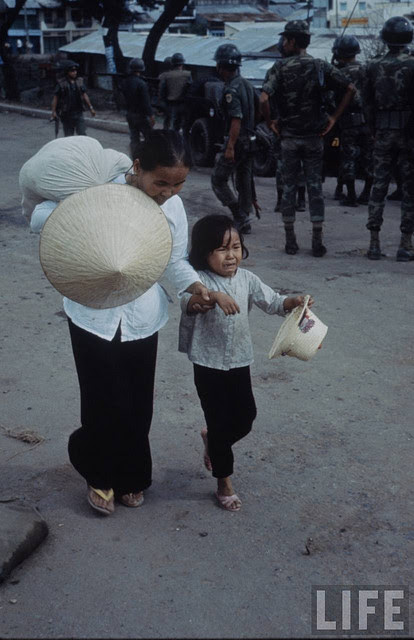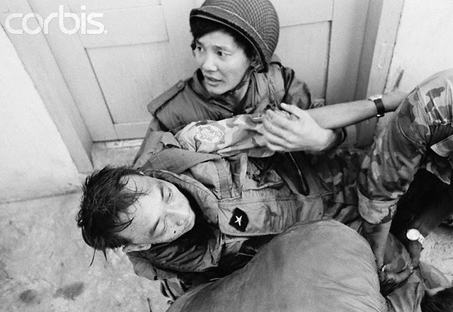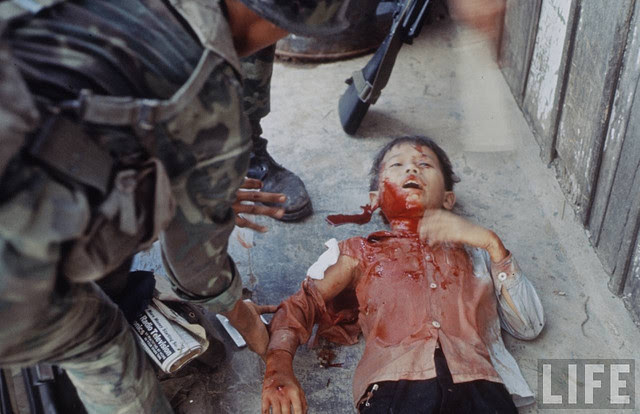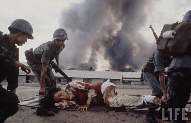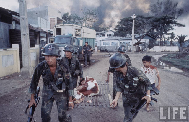 Toán Lính Biệt động đang giúp đưa một người dân ra khỏi nhà để cấp cứu do trúng mảnh đạn cối của VC -bên cạnh là đứa con đang hớt hải chạy theo người dính đầy máu .