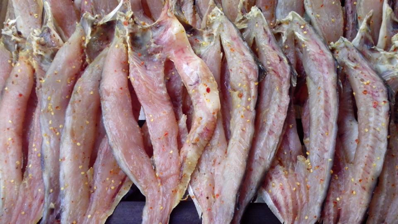 Khô cá biển, mặc dầu mùi khó chịu, nhưng lại ngon. Như cá đuối, cá hố, cá lẹp, cá khoai, cá lù đù, cá chim, cá chìa vôi…