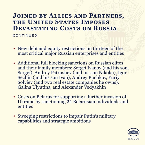 Biden: Today, the United States, along with Allies and partners, is imposing severe and immediate economic costs on Russia in response to Putin’s war of choice against Ukraine. They will have a profound impact on Russia’s economy, financial system, and access to cutting-edge technology.
