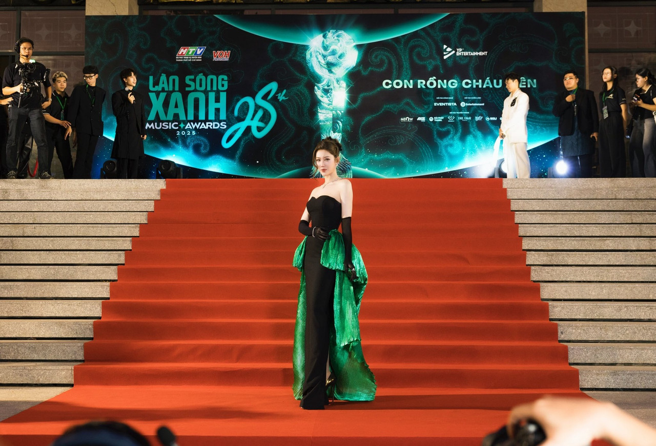 Hôm 31/1, diễn viên Thúy Ngân tham dự lễ trao giải Làn sóng xanh 2025 tại TPHCM. Người đẹp trở thành tâm điểm trên thảm đỏ khi diện bộ váy cúp ngực màu đen có tùng váy xanh lá cây, tôn làn da "trắng phát sáng" cùng đường cong gợi cảm.