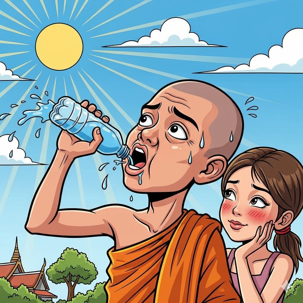 Cô gái trẻ đẹp mang chai nước ra nhưng lại quên mang ly. Nhà sư khát quá, cầm chai tu một hơi.