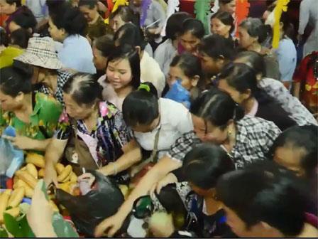 Chùa chiền là chốn linh thiêng, thế nhưng chính những hành động chen lấn xô đẩy nhau để tranh giành đồ lễ chúng sinh vô tình đã phá vỡ sự tôn nghiêm nơi cửa Phật, thực sự rất phản cảm.''