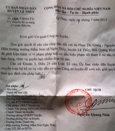 Theo đó, từ những năm 2011, bà Phan Thị Giang - Hiệu trưởng Trường Mầm non xã Ngân Thủy (nay bà Giang đang là Hiệu trưởng Trường Mầm non xã Phú Thủy - PV) đã cùng những người thân tín đang công tác tại trường “ăn chặn” tiền hỗ trợ cho các cháu ở các lớp học vùng cao (mỗi cháu 120.000 đồng/tháng) và tiền lương của các giáo viên dạy hợp đồng tại trường, mỗi giáo viên ít nhất 2 triệu đồng/tháng.