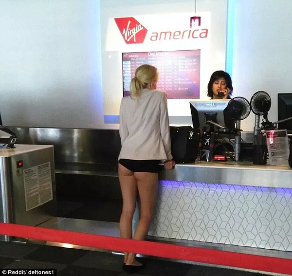 Một cô gái tóc vàng đã khiến tất cả các hành khách đang đứng xếp hàng làm thủ tục check in lên một chuyến bay của Virgin America được phen đỏ mặt khi hồn nhiên mặc một chiếc quần lót, để lộ một phần vòng ba phản cảm tại sân bay.