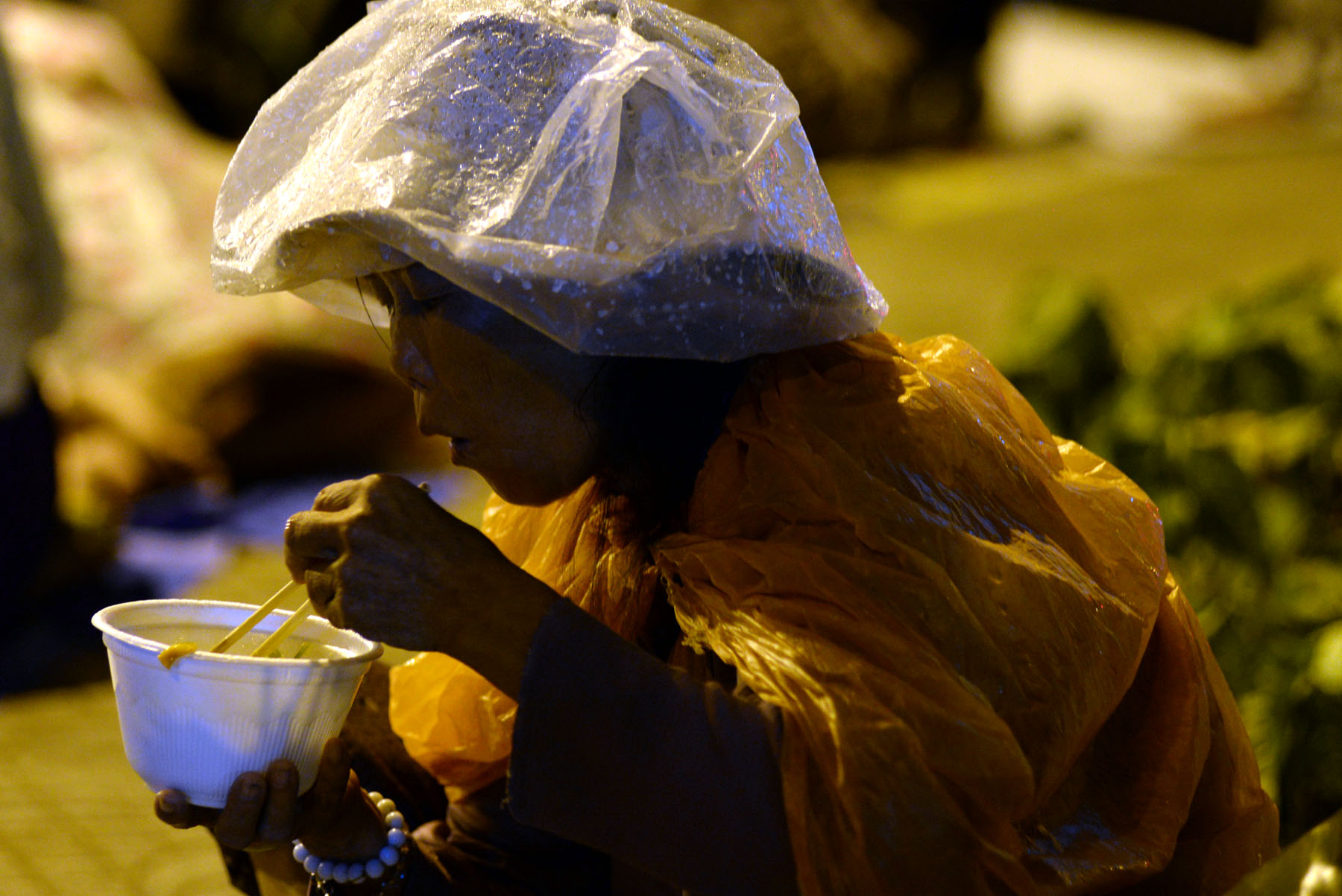 Người phụ nữ bán bánh tráng trộn che chắn kỹ cho hàng hóa hơn bản thân mình. Chị bảo: “Người ướt thì không sao, chứ hàng hóa mà ướt thì cả nhà chết đói”.