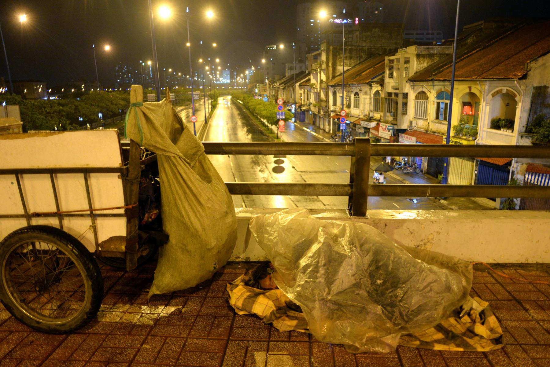 Ông Sáu đã chạy xích lô hơn 30 năm ở Sài Gòn. Ông đã quá quen với những cơn mưa chợt đến rồi chợt đi. Tầm 23 giờ đêm, ông Sáu vẫn cố mang áo mưa chạy chở hàng cho khách quen xong mới về lại chân cầu nghỉ ngơi.