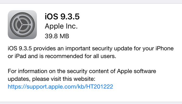 Trong ghi chú phát hành của Apple, iOS 9.3.5 tổng cộng giúp sửa 3 lỗ hổng zero-day (1 trong kernel iOS và 1 trong WebKit) do Citizen Lab và Lookout phát hiện và báo cáo.