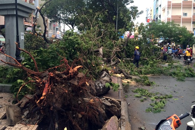 Nhận tin báo, lực lượng chức năng quận 5 đã phong tỏa hiện trường, phân luồng giao thông. Nhân viên cây xanh cũng có mặt để cắt tỉa, đưa những cây đổ rời khỏi hiện trường.