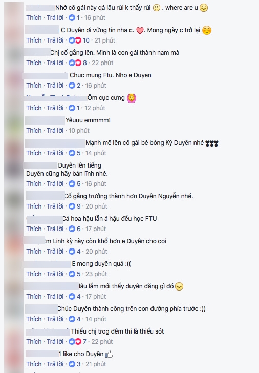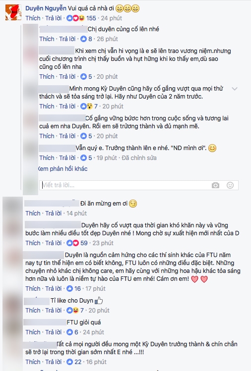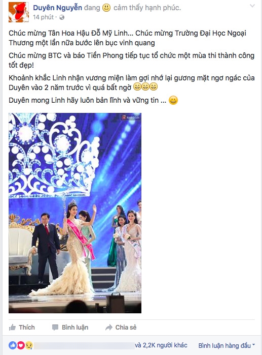 Kỳ Duyên chia sẻ cảm giác khi nhìn thấy Đỗ Mỹ Linh - Tân Hoa hậu Việt Nam 2016 đăng quang và bước những dấu chân đầu tiên trên cương vị hoàn toàn mới, làm cô nhớ lại thời điểm cách đây 2 năm về trước: "Khoảnh khắc Linh nhận vương miện làm gợi nhớ lại gương mặt ngơ ngác của Duyên vào 2 năm trước vì quá bất ngờ". Người đẹp cũng không quên gửi lời nhắn nhủ: "Duyên mong Linh hãy luôn bản lĩnh và vững tin".