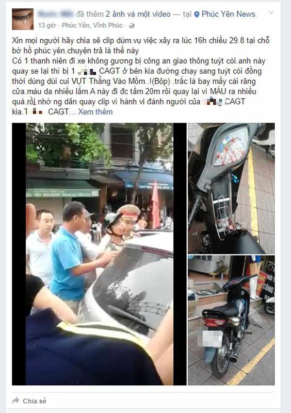 Theo thông tin được chia sẻ thì vào 16h chiều 29.8 tại bờ hồ Phúc Yên, một thanh niên đi xe không gương bị CSGT tuýt còi, khi anh này quay xe lại thì bị 1 CSGT ở bên kia đường chạy sang tuýt còi đồng thời dùng dùi cui vụt thẳng vào mồm.
