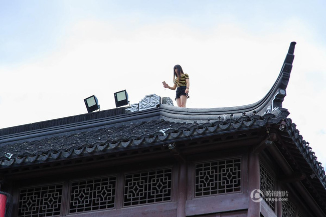 VBF-Vừa qua tại 1 khu miếu linh thiêng tại TQ du khách đã vô vùng kinh ngạc và phẫn nộ trược việc 1 cô gái khá sinh đã tự ý leo hẳn lên nóc miếu để chụp hình.Đây là 1 vụ việc lại chứng tỏ thêm 1 lần nữa ý thức và văn hóa của giới trẻ TQ đang thực sự đáng báo động.Vào lúc 15 giờ ngày 30/8, các du khách tới tham quan khu vực Miếu Phu Tử, thành phố Nam Kinh, Trung Quốc đã được phen hốt hoảng khi chứng kiến cảnh tượng cô gái trẻ hồn nhiên trèo lên nóc một tòa nhà để... tự sướng.Giữa ngày hè nắng nóng, ở trên nóc một tòa nhà bán đồ lưu niệm và đồ ăn, cô gái khoảng 20 tuổi với dáng người nhỏ nhắn cùng mái tóc đen dài và chiếc quần ngắn cũn không ngại ngần tạo đủ các tư thế nhằm tạo ra những bức ảnh "để đời".