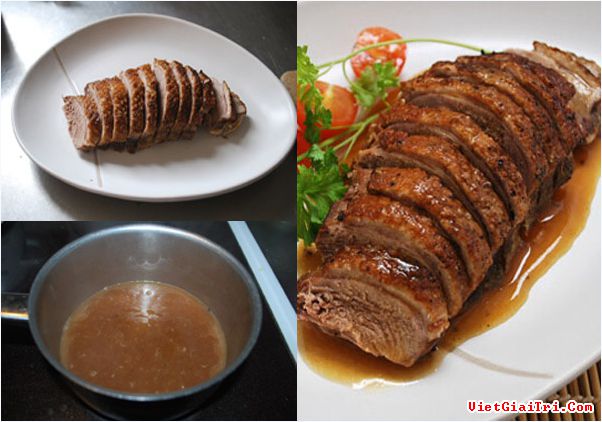 + Đổ một thìa dầu vào chảo, đun sôi, gắp miếng thịt vịt đã tẩm ướp vào. Chú ý đặt phần da vịt tiếp xúc với dầu khoảng 5 phút cho ra hết mỡ và chín vàng như trong hình.
