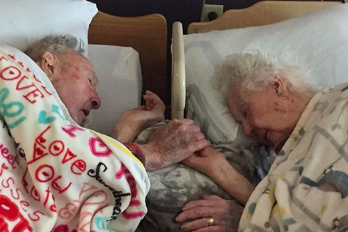 Vietbf.com - Bức ảnh chụp lại khoảnh khắc ông cụ nắm tay vợ trước khi cái chết chia lìa họ sau 77 năm chung sống, nhưng cụ ông và cụ bà nằm trên hai chiếc giường kê sát, quay mặt vào nhau, và đắp chiếc chăn có dòng chữ "I love you" (Anh yêu em) và đưa bàn tay nhăn nheo ấm áp vào tay người vợ.