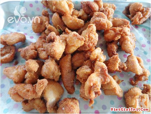 Vẫn chiếc chảo dầu ấy, tiếp tục cho từng ít thịt gà vào chiên cho vàng giòn thì vớt ra đĩa.