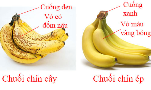 Chuối chín tự nhiên sẽ có phần cuống đen, nhiều đốm nâu trên vỏ. Chuối chín có xử lý hóa chất thường có vỏ màu vàng bóng, cuống xanh và không có đốm trên bề mặt vỏ.