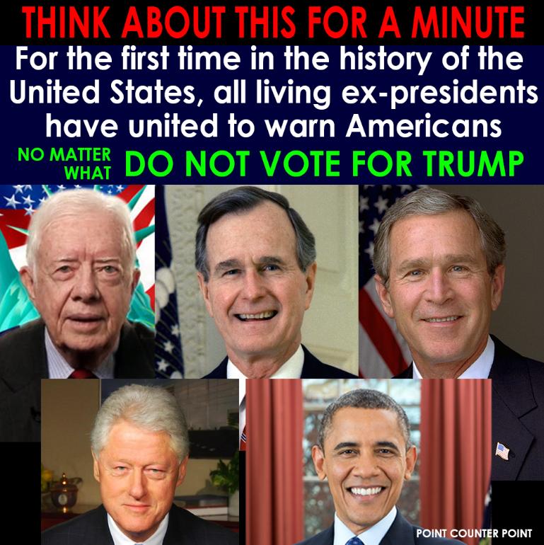Hình ảnh được đăng tải cho thấy, hai tổng thống của đảng Dân chủ cũ (Bill Clinton và Jimmy Carter) hai vị tổng thống đảng Cộng hòa trước đây (George W. Bush và George HW Bush) và Tổng thống Barack Obama là trong số những người được cho là kêu gọi người Mỹ không bỏ phiếu cho Donald Trump