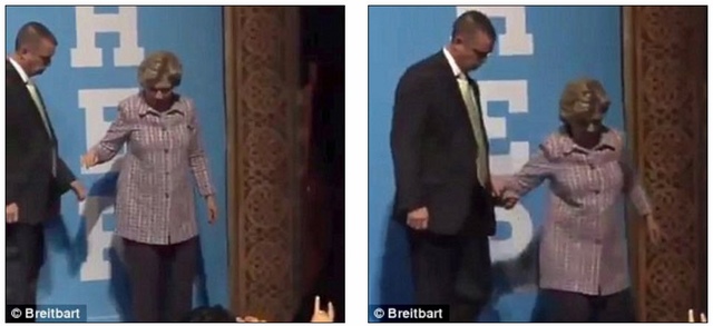 Khi kết thúc bài diễn văn, bà tiến về phía cửa thoát hiểm. Tờ Breibart News nhận thấy cựu ngoại trưởng phải đưa tay để mật vụ dìu xuống. Hôm 11.9, bà Clinton cũng loạng choạng và được đặc vụ dìu vào xe hộ tống.