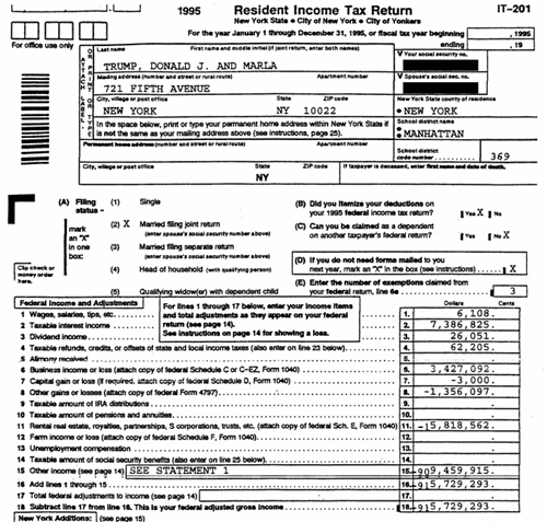 Ông Trump tuyên bố mất gần 1 tỉ USD trên tờ khai thuế thu nhập của mình năm 1995 theo các lần báo cáo. Một tuyên bố chưa chính thức từ người phụ trách chiến dịch của Trump được đưa lên trang web của ông vào cuối ngày 1 tháng 10. Trong đó không xuất hiện bất kỳ một xác nhận, từ chối hay tranh cãi nào về những gì tờ Times đưa ra, nhưng lại khẳng định rằng đó là những tài liệu không hợp pháp.