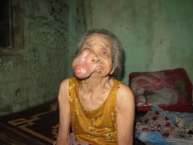 Năm 2013, khối u phình to kéo dài từ tận mắt đến hết cằm, lấn sang hết phần mũi phía bên phải và chiếm hơn nửa khuôn mặt. Trên khối phình to ấy các sợi gân xanh, đỏ chen chúc nhau. Hiện tại, trên khối u có một chỗ nhô lên, mọng nước và tưởng chừng như nó sẽ vỡ ra bất cứ lúc nào. Ở cái tuổi cổ lai hy khối u nặng nề này không chỉ khiến bà vất vả trong đi lại mà ngay ăn, nói cũng rất khó khăn.