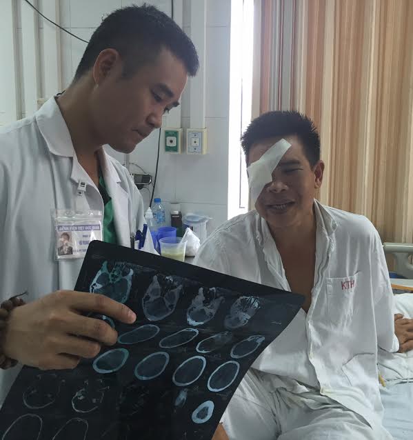 Thấy đau nhói và cứng ngắc một bên mặt, tối tăm mặt mũi, anh sờ thấy dị vật và cố rút ra nhưng không được, nhìn qua con mắt còn lại thấy máu chảy ròng ròng. Lấy điện thoại gọi cho người thân đến đưa đi cấp cứu, thấy máu chảy quá nhiều, anh T. cởi cả chiếc áo đang mặc thấm cầm máu và được đưa đến BV đa khoa tỉnh Tuyên Quang.Tại đây các bác sĩ tiến hành sơ cứu, tiêm thuốc cầm máu cho bệnh nhân, chụp phim, tiêm phòng uốn ván. Trên phim chụp thấy đinh vít đâm rất sâu vào toàn bộ xương mặt của bệnh nhân; nếu rút ra nguy cơ tổn thương hệ mạch máu,mạch não, tổn thương mắt nên BV Tuyên Quang quyết định chuyển ngay bệnh nhân xuống BV Việt Đức.