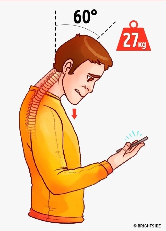 Theo Bright Side, ngày nay xu hướng sử dụng smartphone và các thiết bị cầm tay nhiều giờ trong ngày rất phổ biến. Khi bạn cúi thấp đầu xuống khoảng 30 hoặc 600 , áp lực dồn vào cột sống, gây ảnh hưởng đến phổi và một số cơ quan khác.