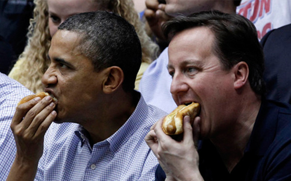 Một khoảnh khắc thú vị khác cho thấy cách làm chính trị của Obama cũng vô cùng cởi mở, đó là cùng thủ tướng Anh – David Cameron thoải mái gặm chiếc bánh mì kẹp xúc xích trong khi hai người cùng đi xem một giải đấu bóng. Chà, đúng là Obama rất tinh ý đấy, chẳng phải người ta thường dễ chịu với nhau hơn khi cái bao tử đã được no đủ hay sao.