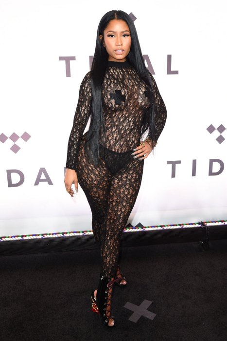 Tại sự kiện,rapper nữ tên tuổi này đã gây choáng khi diện bộ đồ lưới táo bạo khoe hết vòng 1 chỉ được che chắn bằng hai miếng băng dính, còn bên dưới thì Nicki mặc chiếc underwear nhỏ xíu, đủ để "che những gì cần che".