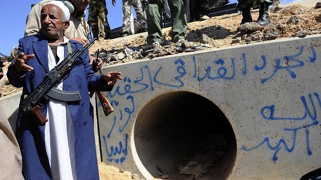 Sau đó họ lại bị bao vây và Gaddafi bị lôi ra từ một ống cống và bị giết chết sau đó.