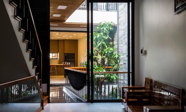Nhờ lợi thế chiều dài tới 40m, chủ nhà đã dành nguyên một khoảng không ở giữa để trồng cây xanh, lấy ánh sáng và khí trời cho ngôi nhà.