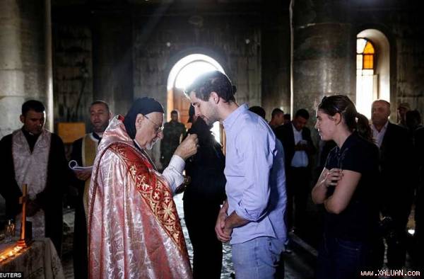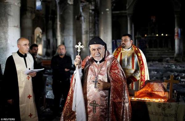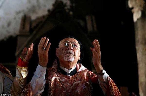 Một linh mục đang cử hành nghi lễ cầu nguyện ở thị trấn Qaraqosh gần Mosul. Đây là lần đầu tiên người dân và các linh mục ở làng này làm lễ cầu nguyện vào ngày Chủ nhật kể từ khi IS xâm chiếm nơi này.