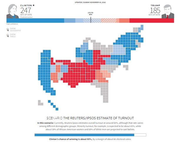 Khảo sát của Reuters cho thấy bà Clinton nắm tới 90% khả năng giành chiến thắng với số phiếu đại cử tri thu được tới ngày 7.11 đã là 303 lá.