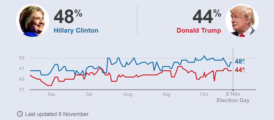 Các trang tin của Mỹ đều công bố những thăm dò về số phiếu cũng như phần trăm ủng hộ hai ứng cử viên là Hillary Clinton và Donald Trump. Nếu như Trump chỉ đôi lần vượt qua đối thủ của mình ở một số bang thì Clinton vẫn luôn dẫn trước. Mặc dù tỉ số khá sát nhau nhưng theo lần thăm dò cuối thì bà Clinton nắm 90% cơ hội chiến thắng.