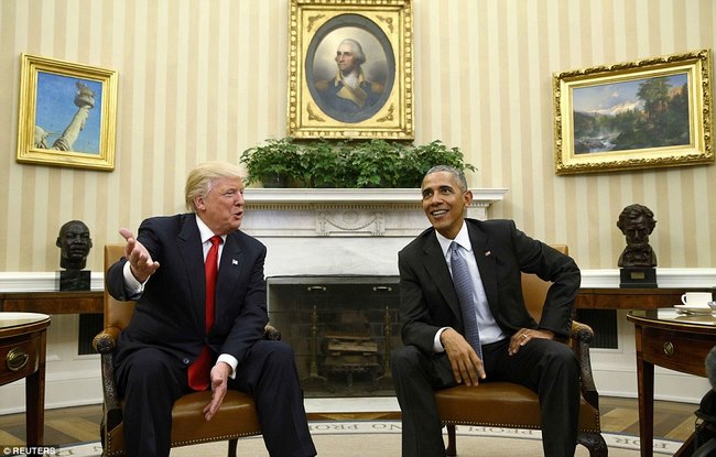 Tổng thống đương nhiệm Barack Obama và ứng viên tổng thống Donald Trump đã trò chuyện hơn 90 phút trong phòng Bầu dục. Vợ của hai ông gặp nhau ở một phòng khác trong Nhà Trắng.