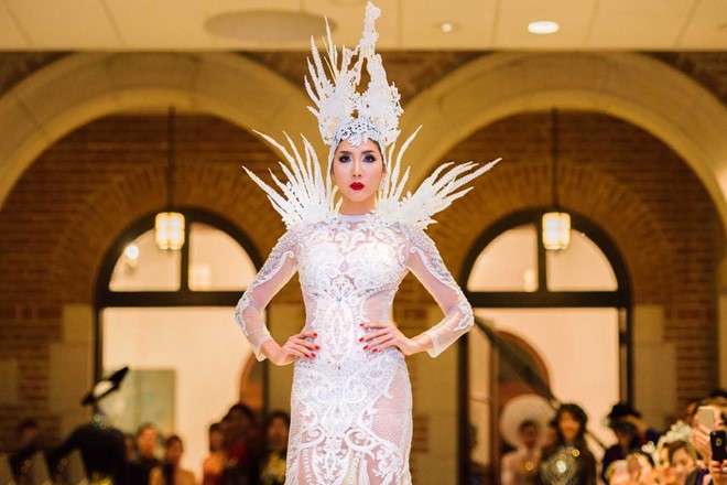 Trên sàn diễn thời trang dành cho kiều bào Việt tại Mỹ, nữ người mẫu sinh năm 1988 diện váy dạ hội xuyên thấu, ánh bạc sải bước tự tin.