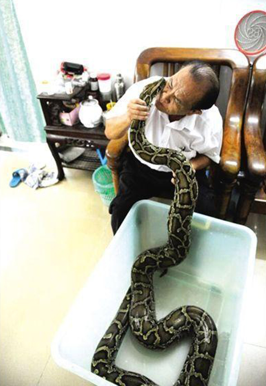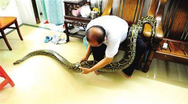 Mặc cho phải đối mặt với sự an toàn đến tính mạng nhưng vợ chồng ông Shi Jimin, người thành phố Hải Khẩu, tỉnh Hải Nam, Trung Quốc vẫn không lo sợ khi cùng chung sống dưới một mái nhà với con trăn khổng lồ.