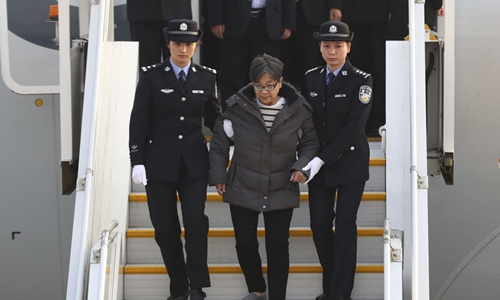Dương Tú Châu bị áp giải xuống máy bay khi hạ cánh tại Bắc Kinh. Ảnh: Reuters