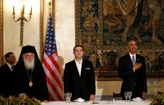 Tổng thống Obama đứng bên cạnh Thủ tướng Hy Lạp khi tham dự bữa tối danh dự tại phủ Thủ tướng ở Athens, Hy Lạp.