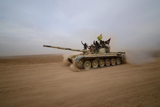 Chiến binh người Shi'ite lái xe tăng về phía Tal Afa, phía Tây Mosul hôm 16-11. Ảnh: REUTERS
