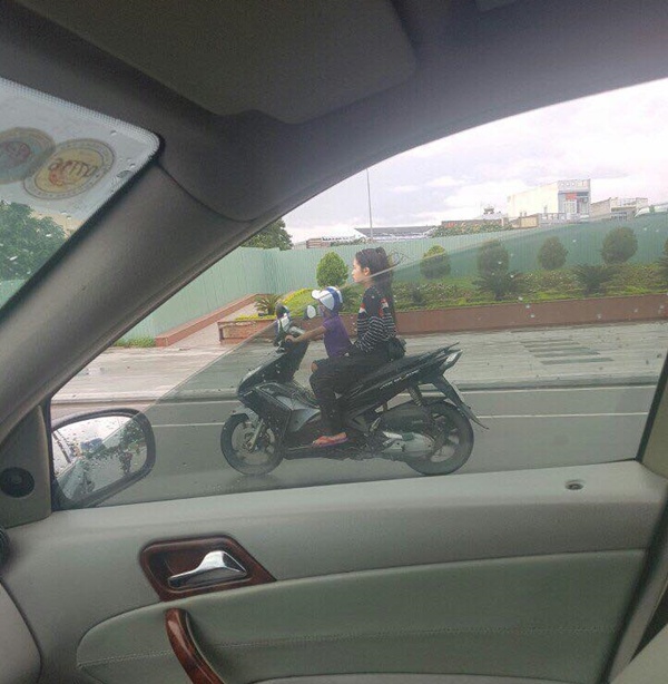 Điều đáng nói ở đây là đứa bé còn rất nhỏ, chỉ ở độ tuổi mẫu giáo. Không chỉ vậy, thời điểm chụp bức ảnh thời tiết đang mưa, đường trơn ướt nhưng cả hai người đều không đội mũ bảo hiểm khi lái xe.