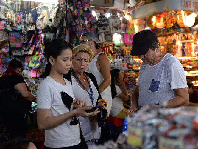 Khách tới chợ Bến Thành (TP.HCM) chủ yếu là người nước ngoài nên việc giao tiếp bằng ngoại ngữ trở thành yếu tố quyết định để bán được nhiều hàng.