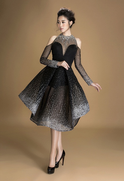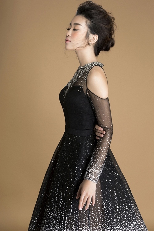 Thiết kế váy quây ngực có phần thân áo được giữ nguyên sắc đen tuyền. Trong khi đó, tùng váy được xử lý tạo khối bồng bềnh lãng mạn. Chi tiết ánh kim lấp lánh điểm xuyết trên phần chân váy tăng độ bắt sáng.