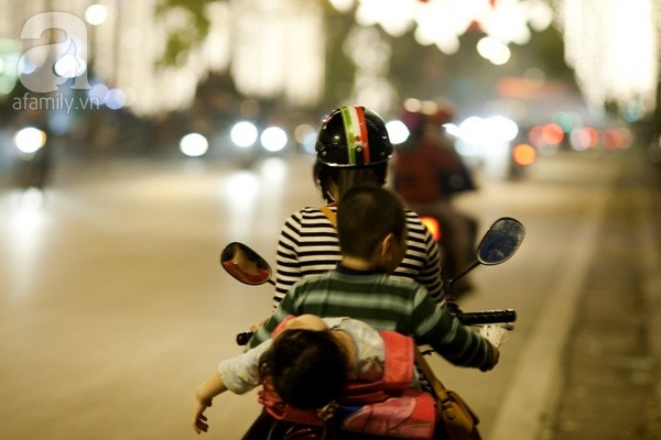 Theo quan sát, trên xe lúc này có 3 em nhỏ, một bé đứng phía trước, một bé ngồi ôm mẹ phía sau còn cậu bé lớn nhất chừng 7, 8 tuổi thì nằm bò ra yên sau và dùng hai tay vịn vào tay kéo của xe hàng rong.