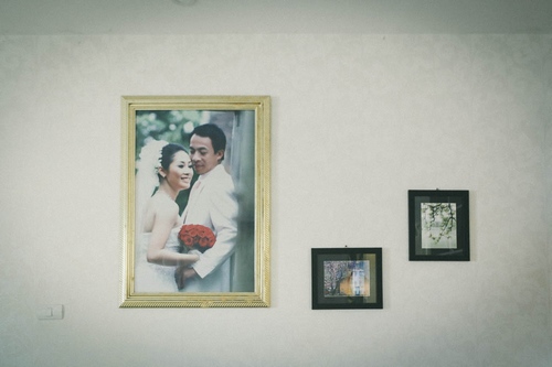 Những bức ảnh cưới của cặp đôi được treo trang trọng trên tường.